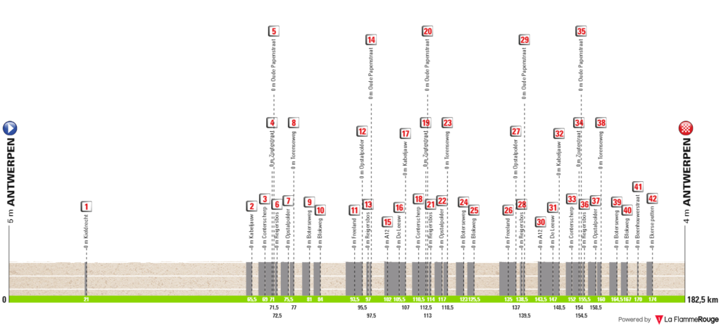 Le départ de de l’Antwerp Port Epic 2024 sera donné ce dimanche 19 mai à 12h30 depuis la Schengenplein op het Eilandje à Anvers. C’est un parcours digne d’une classique flandrienne qui attendra les participants puisque pas moins de 50 kilomètres de secteurs pavés ou empierrés attendra les engagés du jour. Les coureurs à l’aise sur les Flandriennes trouveront là un terrain de jeu idéal sur les 190,5 kilomètres du jour. L’arrivée est prévue aux environs de 17h00.