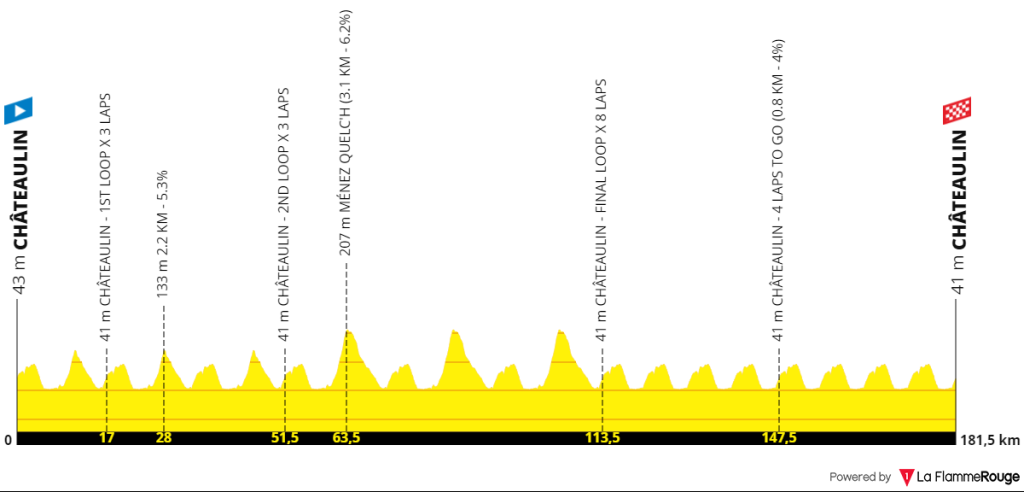 C’est à 13h00 que sera donné le départ des Boucles de l’Aulne 2023 (1.1). La 12 manche de la Coupe de France, qui se dispute ce dimanche 14 mai, consistera en plusieurs boucles autour de Châteaulin. Le parcours au profil vallonné sera long de 181,1 kilomètres. Trois tours de 17,3 kilomètres, puis trois tours de 20,4 kilomètres et enfin huit tour de 8,5 kilomètres seront à parcourir. Sur le parcours final, la côte de Châteaulin proposera 800 mètres à 4% pour durcir la course.