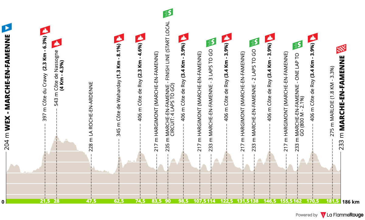 Le final s’annonce animé avec un circuit local sélectif comprenant notamment la côte de Roy (3,4 km à 4,2 %) et la côte de Marloie (1,8 km à 3,5 %), placée à moins de 5 kilomètres de l’arrivée. Tout laisse penser que la décision se fera dans un groupe restreint, avec une arrivée jugée aux alentours de 16h30 sur l’Avenue de la Toison d’Or à Marche-en-Famenne.