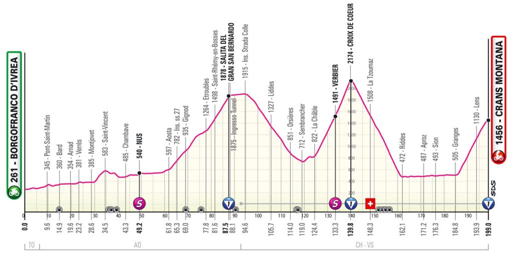 La 13e étape du Giro 2023 mènera les coureurs de Borgofranco d’Ivrea à Crans-Montana. Sur 199 kilomètres, le profil de l’étape du jour est très montagneux avec pas moins de trois cols. Le premier, le Col du Grand-Saint-Bernard, a été escamoté sur son sommet à plus de 2 400 mètres d’altitude, impraticable. Une solution alternative permettra de gravir le col jusqu’à 1 800 mètres avant de plonger vers la Croix de Coeur (15,5 km à 8,6%) à 59,2 kilomètres de l’arrivée puis Crans-Montana (12,9 km à 7,2%) qui sera le terme de cette 13e étape du Tour d’Italie 2023.