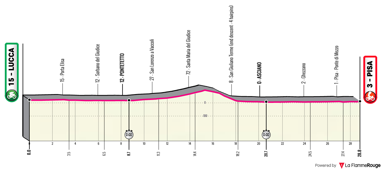 Après le premier point intermédiaire, situé aux abords de la montée vers le tunnel des Monti Pisani (950 m), le profil devient légèrement ascendant. Ce faux-plat pourrait faire la différence. La suite du parcours est rapide, avec de larges courbes et des lignes droites favorables aux coureurs bien posés sur leur vélo de contre-la-montre.