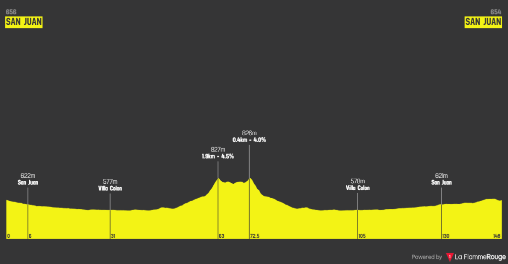 Le lendemain de la journée de repos, les coureurs prendront le départ de la 5e à Chimbas. Ce sera ni plus ni moins que l’étape reine de ce Tour de San Juan 2023. C’est en effet au sommet de l’Alto del Colorado que sera jugée l’arrivée du jour. La montée longue d’environ 13 kilomètres affiche un pourcentage moyen de 4,8% mais est exposée au vent. Enfin, les deux dernières étapes serviront de « critériums » autour de San Juan avec des étapes destinées aux sprinteurs.