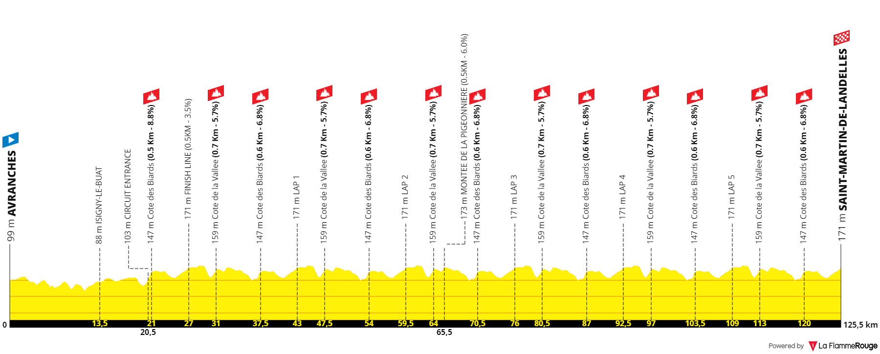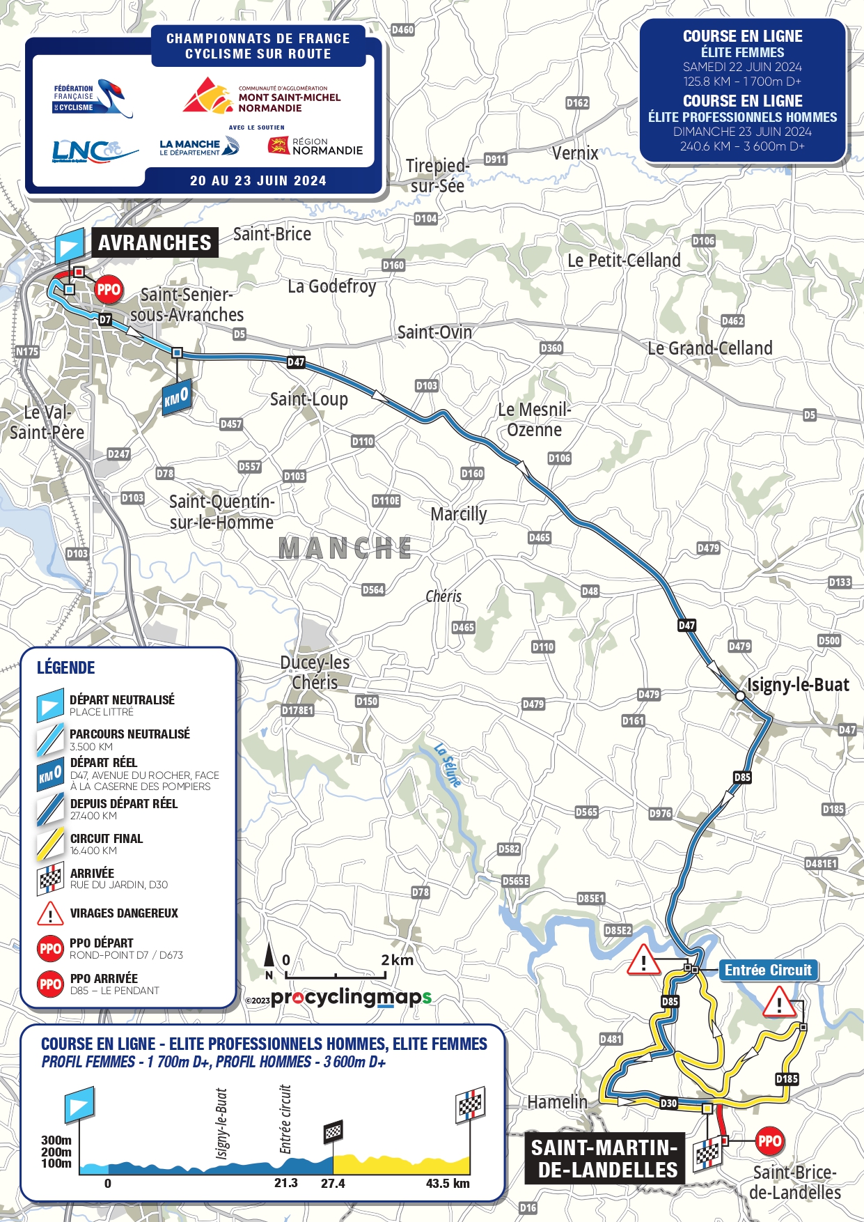 C’est de Avranches que seront donnés les départs des courses en ligne du Championnat de France 2024 les samedi 22 et dimanche 23 juin pour les femmes et les hommes. Après une première partie en ligne très courte, les pelotons arriveront sur le circuit tracé à Saint-Martin-de-Landelles. Le circuit est long de 16,4 kilomètres et comporte deux bosses. La Côte des Biards (0,5 km à 8,8%) et la Côte de la Vallée (0,7 km à 5,7%) devraient durcir suffisamment la course pour créer une véritable sélection.