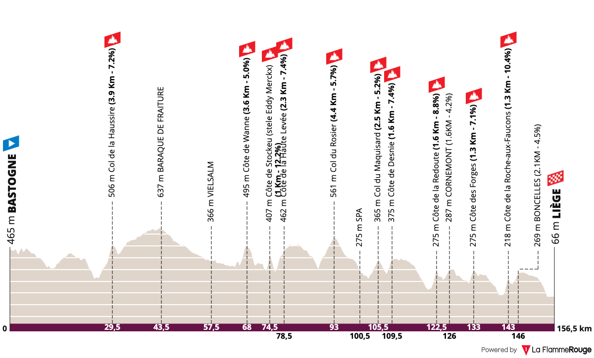 Le final devrait une nouvelle fois être décisif. La côte de La Redoute (1,5 km à 9,1%) constitue un premier point clé, avant une fin de course exigeante avec la côte des Forges puis la Roche-aux-Faucons (1,2 km à 11%), dont le sommet est situé à une dizaine de kilomètres de l’arrivée. Après cette dernière difficulté, la descente vers Liège pourrait favoriser les attaques ou permettre à un petit groupe de se disputer la victoire sur les derniers hectomètres.