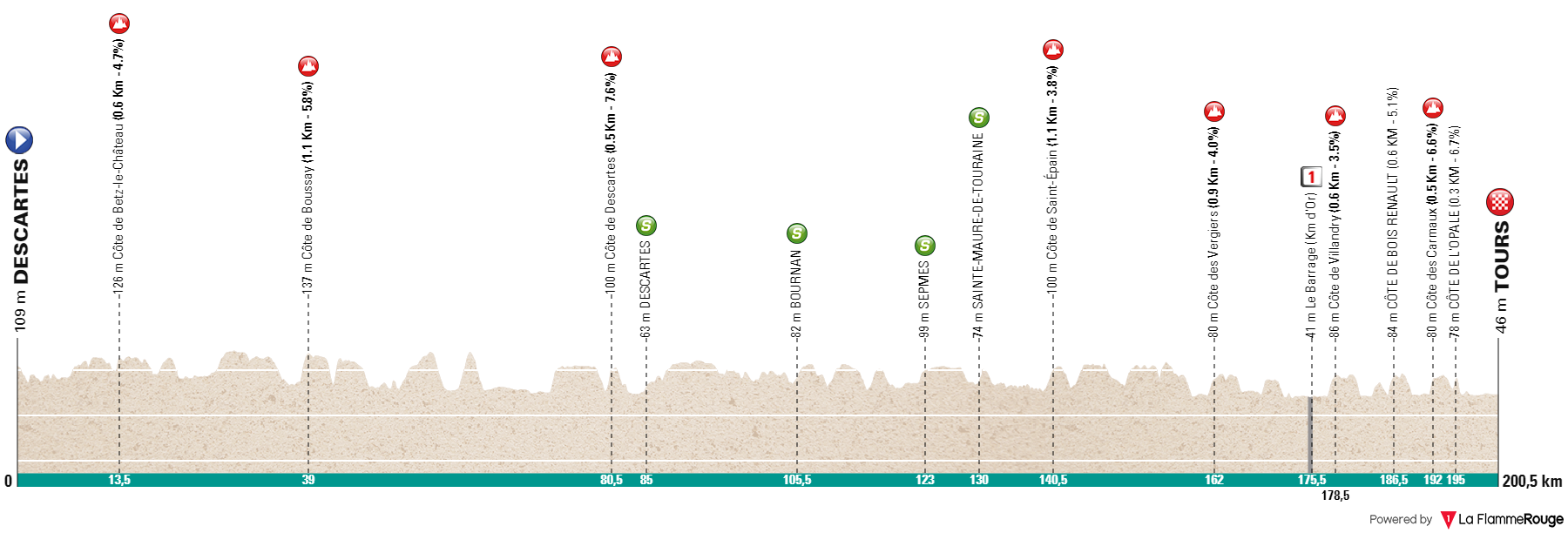C’est de Descartes que sera donné le départ de La Roue Tourangelle 2024 (1.1) ce dimanche 24 mars. Sur un parcours long de 200 kilomètres, la 5e manche de la Coupe de France devrait permettre à une échappée du prendre du champ avant d’arrivée sur Tours, où sera jugée l’arrivée. Dans le final, quelques bosses permettront de dynamiter les pelotons et proposeront une rampe de lancement idéale pour les puncheurs comme les côtés des Carmaux (0,5 km à 6,6%) et de l’Opale (0,3 kilomètres à 6,7%) placées dans les dix derniers kilomètres. L’arrivée est prévue autour de 18h00.