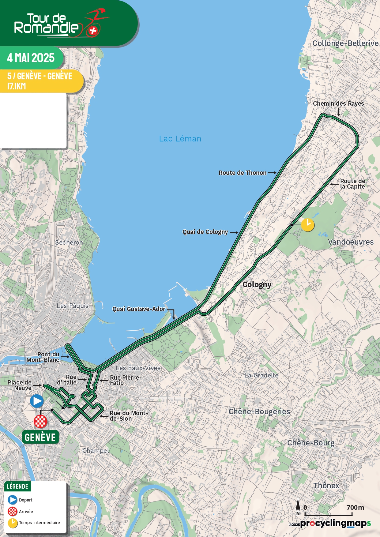 La 5e étape du Tour de Romandie 2025 se dispute en contre-la-montre individuel à Genève ce dimanche 4 mai. L’étape du jour est longue de 17,1 kilomètres et va sceller le classement général de cette édition. Le parcours est fait pour les spécialistes malgré la présence de plusieurs bosses sur le profil. D’entrée de jeu, ce sont 300 mètres à 7,8% qui vont mettre les les coureurs engagés sur de bons rails avant d’entamer une longue portion roulante propice aux purs rouleurs.