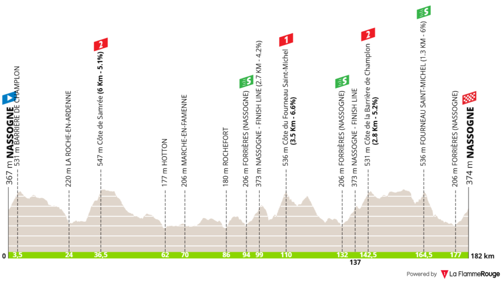 Le Tour de Wallonie 2025 s’ouvrira le 26 juillet avec une première étape en boucle autour de Nassogne. Longue de 182 kilomètres, cette journée inaugurale ardennaise propose un parcours vallonné cumulant près de 2 700 mètres de dénivelé positif, marqué par des côtes exigeantes telles que Samrée, la Barrière de Champlon ou encore le Fourneau Saint-Michel. Les deux boucles locales tracées en fin d’étape devraient offrir un final explosif aux puncheurs, capables de faire la différence dans un sprint en côte.