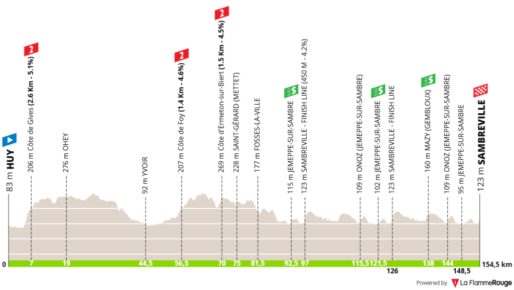 Le lendemain, le peloton s’élancera de Huy en direction de Sambreville (Tamines) pour une étape de 153,7 kilomètres au profil moins accidenté mais toujours piégeux. Les ascensions intermédiaires de Gives, Foy ou encore Ermeton-sur-Biert pourraient émousser les jambes avant une arrivée en faux plat montant, favorable aux sprinteurs puissants comme aux audacieux tentant de surprendre en fin de course. La troisième étape, entre Estinnes et Antoing (165,3 km), semble davantage promise aux purs sprinteurs, sur un tracé globalement plat et rapide.