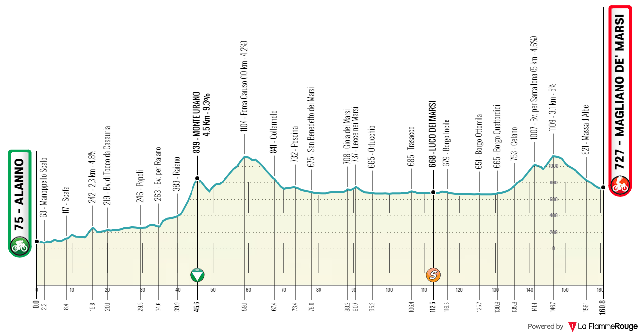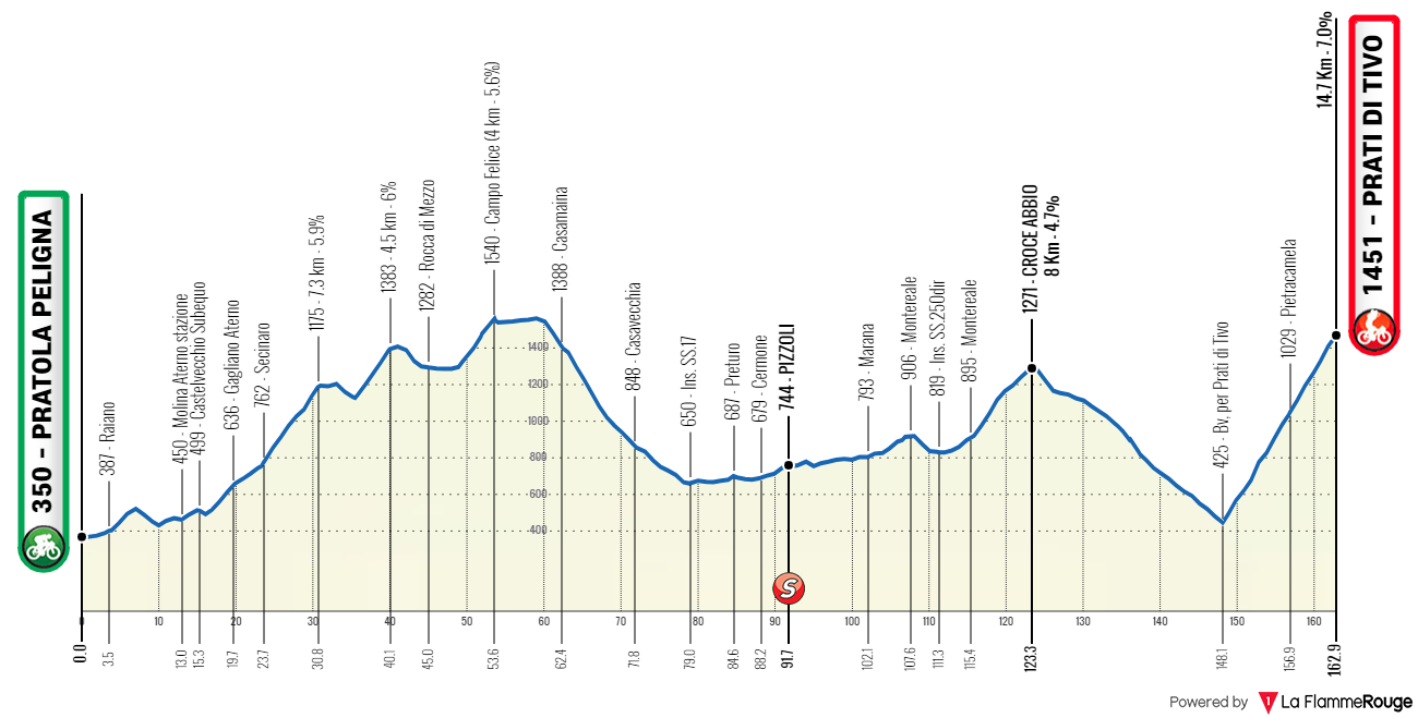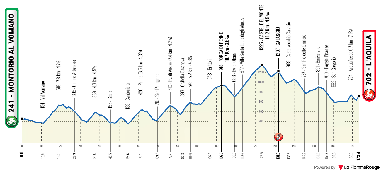 La dernière étape est caractérisée par un profil très vallonné avec beaucoup de dénivelé, mais sans grosses montées. Les coureurs affronteront les ascensions de Forca di Penne et de Castel del Monte, toutes deux présentant des pentes d’environ 4/5%, et qui seront également au programme du Giro d’Italia Femmes 2024 quelques mois plus tard.